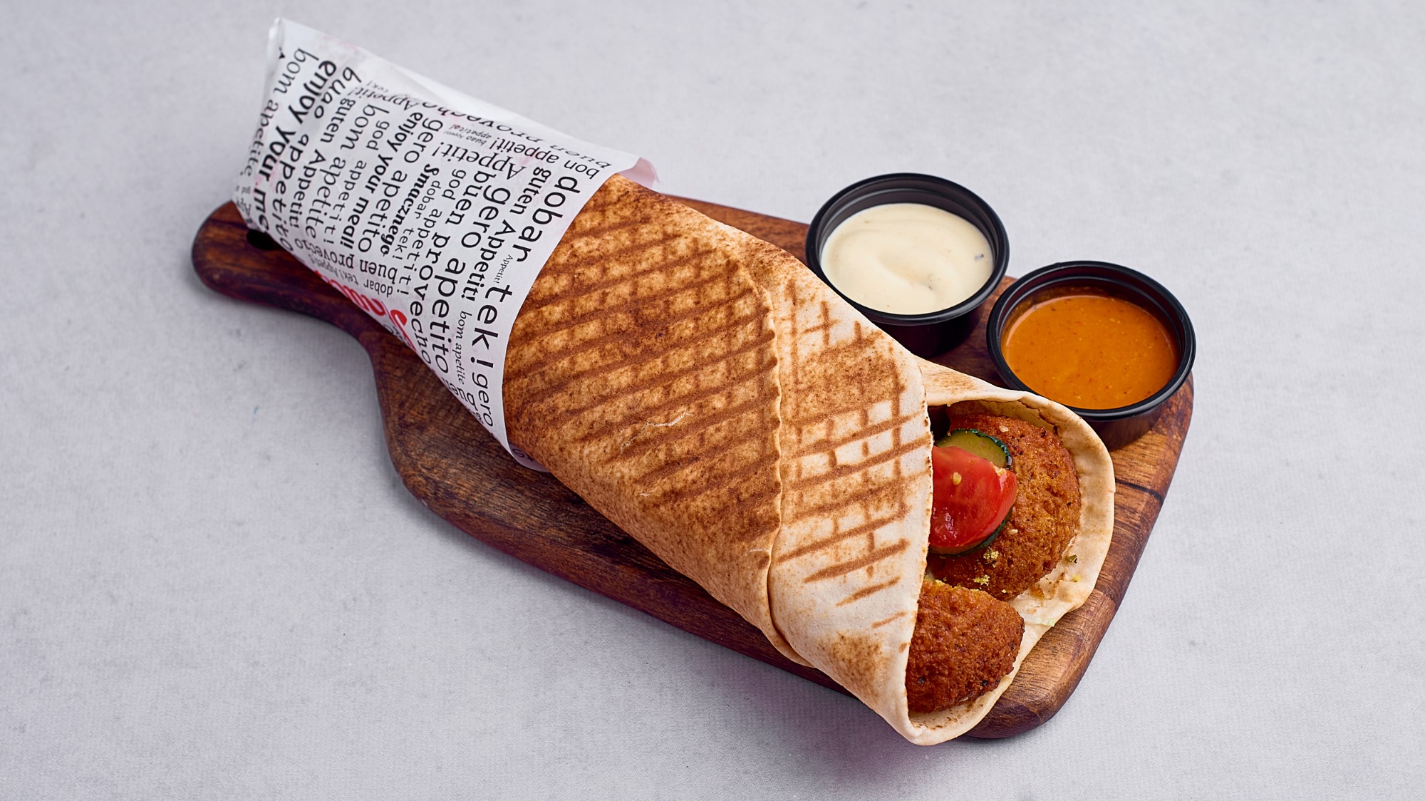 z mięsem do wyboru, surówką (biała kapusta, kapusta czerwona, marchew, ogórek, pomidory) i sosem